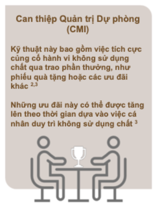 Nghiên cứu chỉ ra rằng việc trao thưởng cho hành vi không sử dụng chất gây nghiện hiệu quả hơn so với việc trừng phạt các đối tượng tái nghiện, mang lại giá trị của Quản trị Dự phòng trong chiến lược điều trị nghiện. Trong các phương pháp điều trị bằng Quản trị Dự phòng, bệnh nhân nhận được phần thưởng, như tiền mặt hoặc phiếu quà tặng, nếu họ đạt được kết quả sức khoẻ tốt (ví dụ, kết quả xét nghiệm nước tiểu không có chất gây nghiện). Ngoài ra, những chương trình này có thể cung cấp phần thưởng lớn hơn cho bệnh nhân mỗi khi xét nghiệm ma túy của họ âm tính (tức là kết quả tích cực), và giá trị phần thưởng họ nhận được sẽ càng tăng lên theo thời gian nếu kết quả duy trì âm tính.