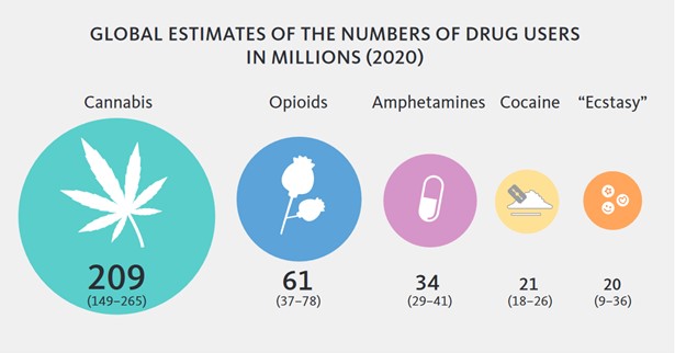 Theo báo cáo năm 2022 của Văn phòng phòng chống tội phạm của Liên hiệp quốc (UNODC), tỷ lệ sử dụng chất gây nghiện bất hợp pháp vẫn ở mức cao trên toàn thế giới. Ước tính có khoảng 284 triệu người trong độ tuổi 15–64, phần lớn là nam giới, đã sử dụng ma túy trong vòng 12 tháng qua. Con số này tương ứng với việc cứ mỗi 18 người thuộc nhóm tuổi này lại có 1 người sử dụng chất gây nghiện bất hợp pháp. Tỷ lệ này đã tăng 26% so với năm 2010, khi số người sử dụng ma túy ước tính là 226 triệu người. (1)
