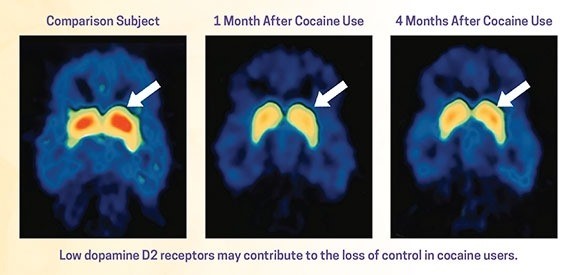 Những bản chụp cộng hưởng từ so sánh não của một người có tiền sử rối loạn sử dụng cocaine (giữa và phải) với não của một người không có tiền sử sử dụng cocaine (trái). Người bị rối loạn sử dụng cocaine có mức độ thụ cảm thể dopamine D2 (được mô tả bằng màu đỏ) thấp hơn ở thể vân một tháng (giữa) và bốn tháng (phải) sau khi ngừng sử dụng cocaine so với người không sử dụng. Mức độ thụ cảm thể dopamine trong não của người sử dụng cocaine cao hơn ở mốc 4 tháng (phải), nhưng chưa trở lại mức quan sát được ở người không sử dụng (trái). (3)